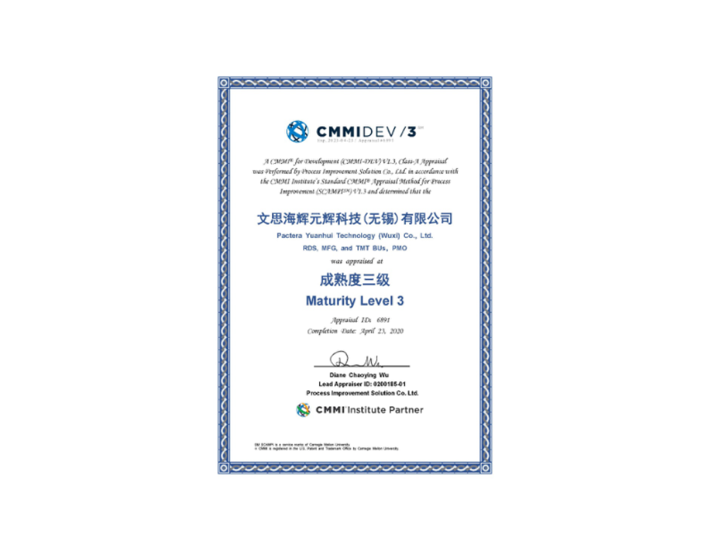 この度、Pactera無錫センター(法人名: Pactera Yuanhui Technology (Wuxi) Co., Ltd.)が、CMMI (Capability Maturity Model Integration)の成熟度レベル3と評価されましたので、お知らせいたします。